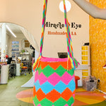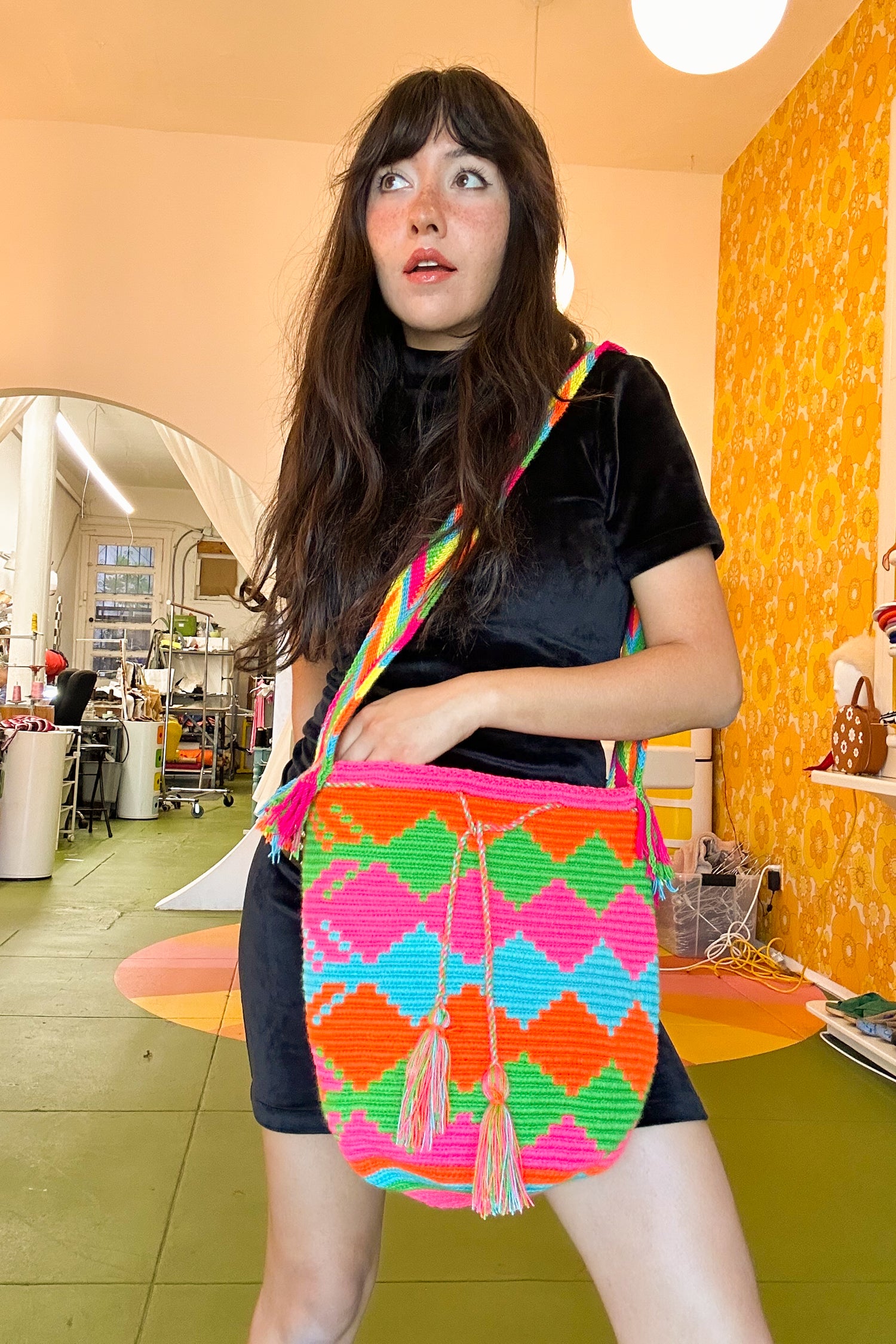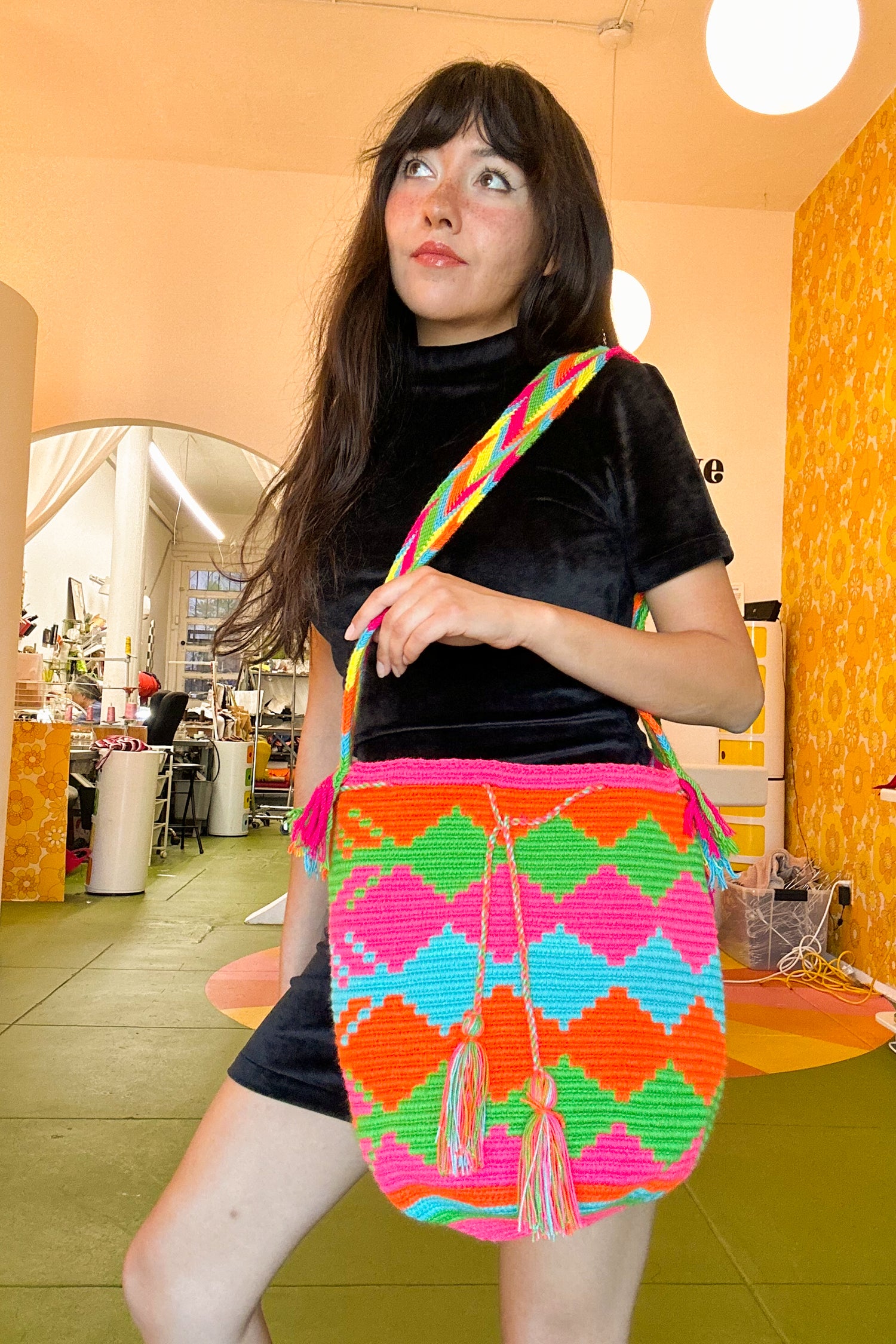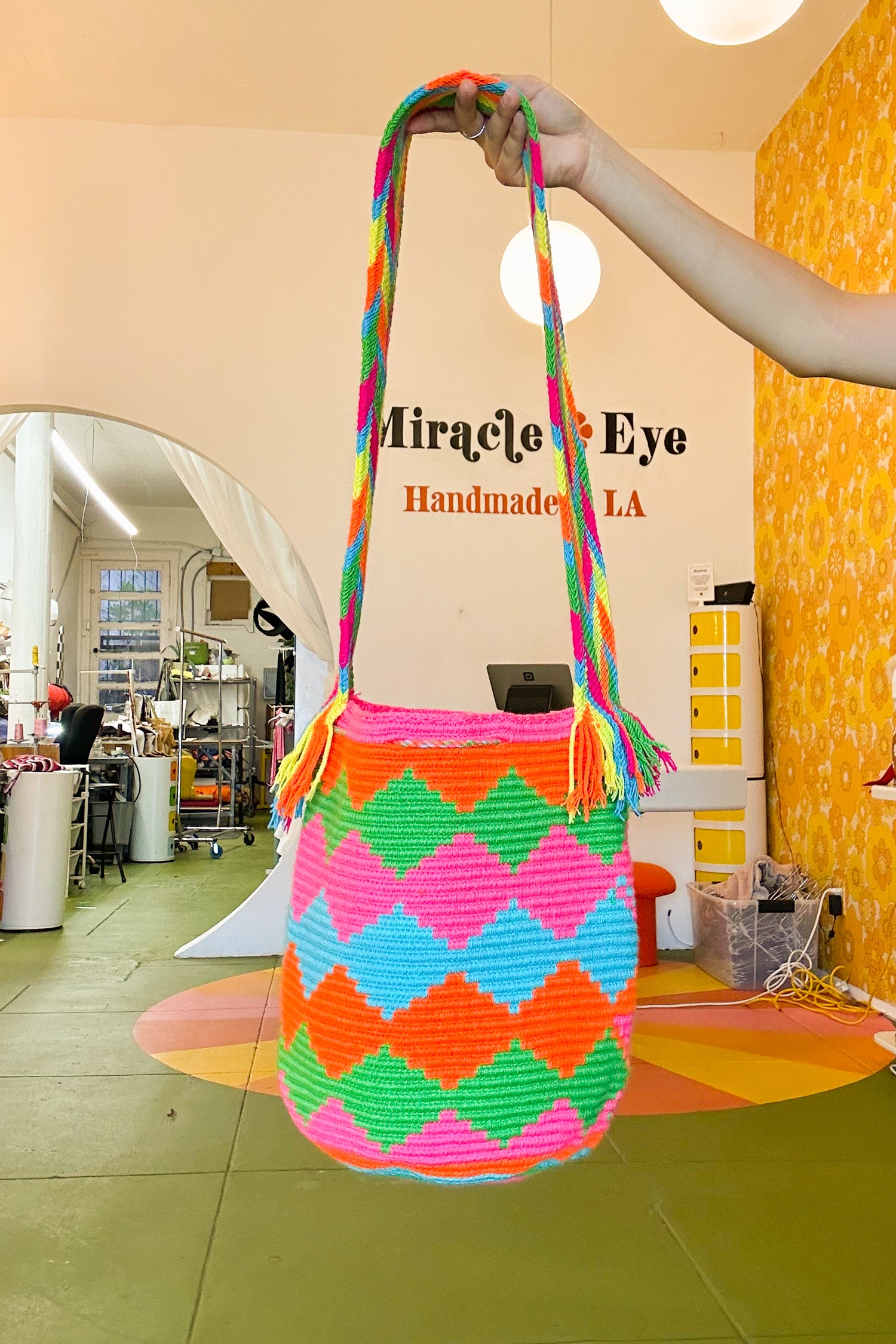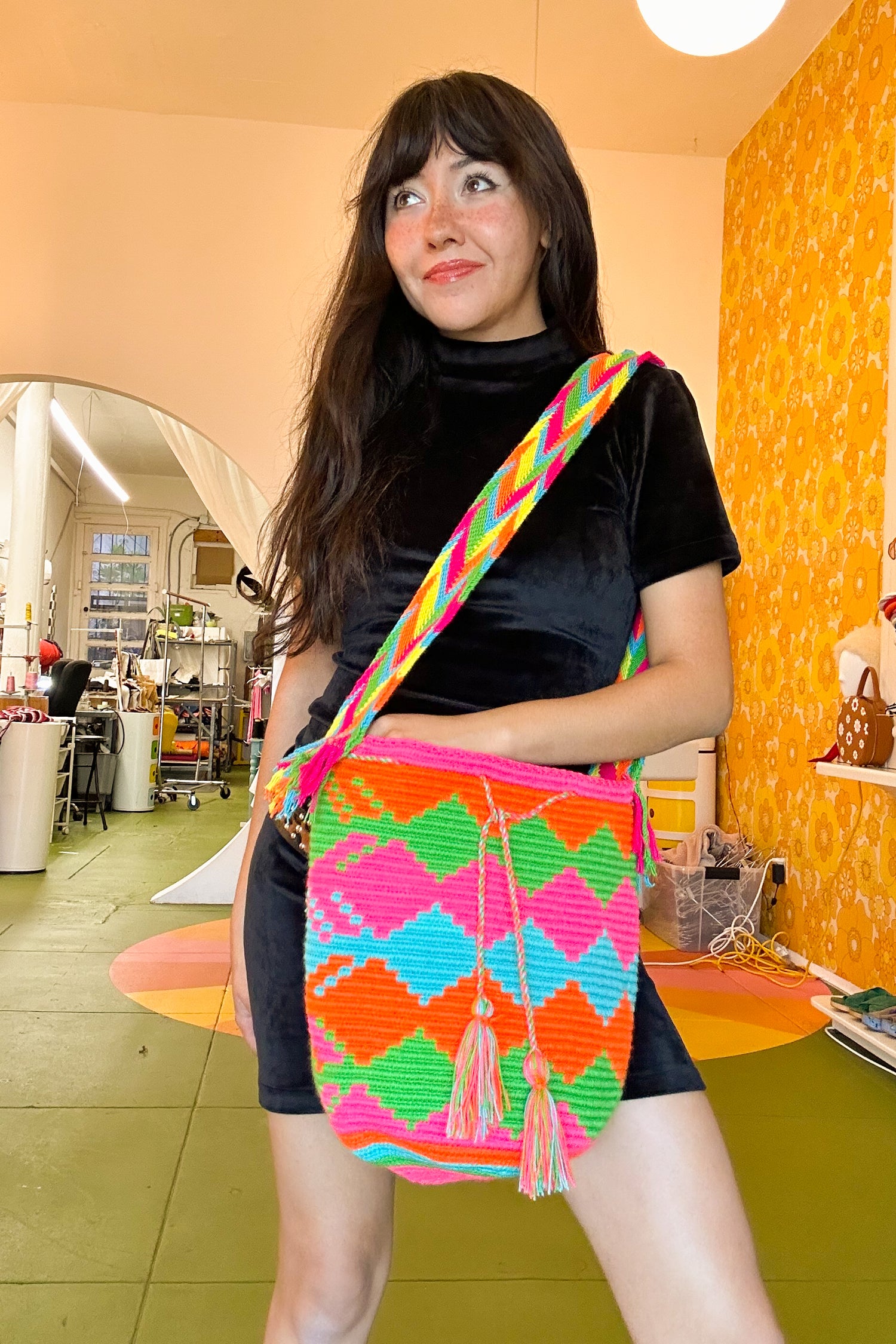 Stunning and colorful Wayuu bag, 100% fair-trade handwoven in Colombia. No two are alike, each is one-a-kind and cannot be restocked once sold. Each has been carefully crocheted by women from the Wayuu tribe in La Guajira, Colombia. My family and I visited our home country Colombia this year and brought these stunning bags back from our travels.