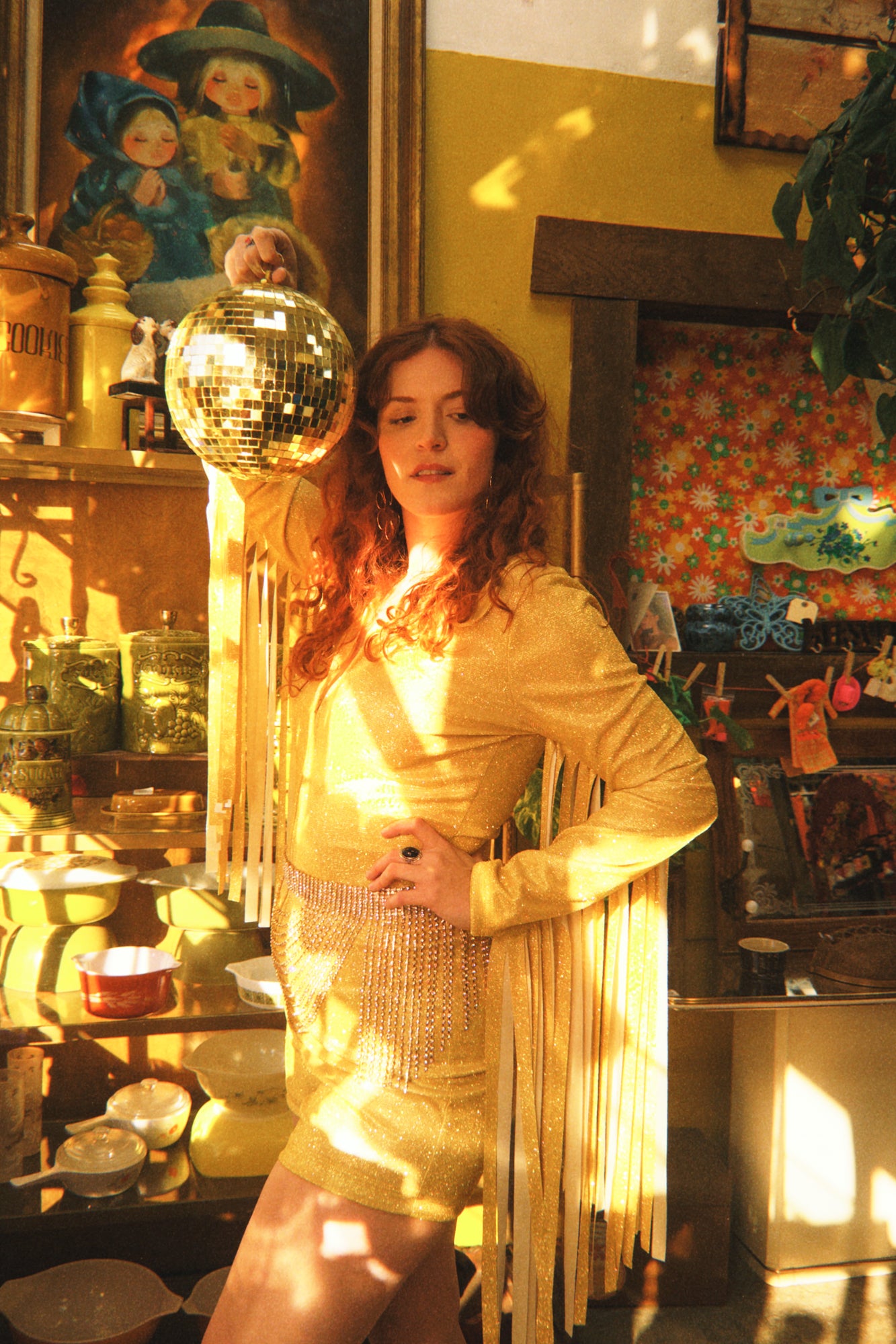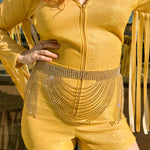Vintage-inspired gold rhinestone layered metal chain belt, pairs like a dream with our velvet rompers and jumpsuits. Adjustable size, can be worn at waist or hip. Major ABBA and Cowboy Carter vibes.