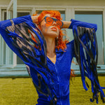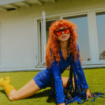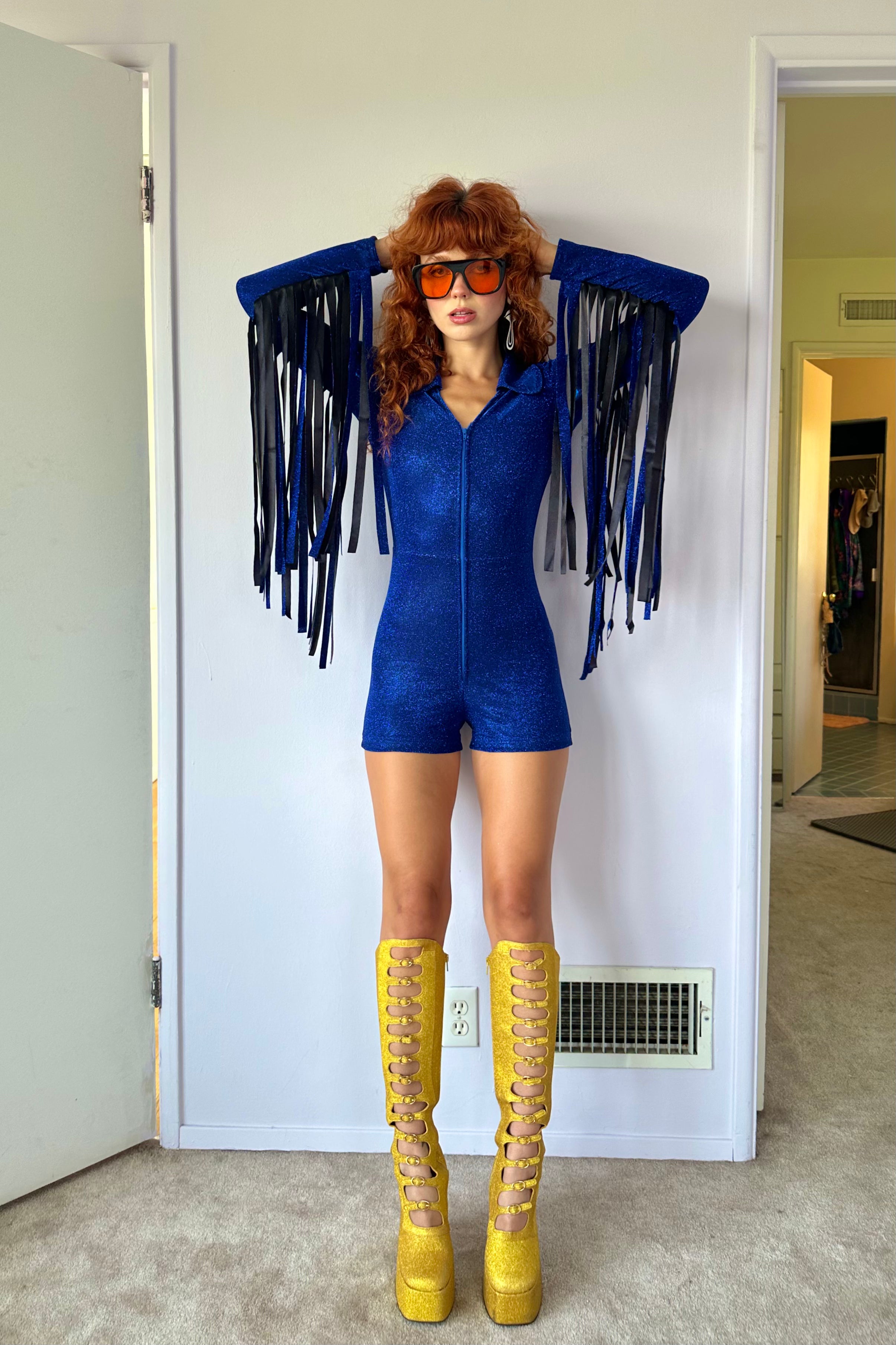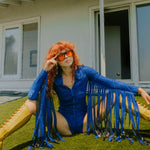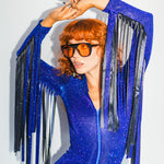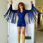 The Glitter Fringe Romper is a disco-meets-cowboy dream come true. Its dreamy details include a zip-up front and fringe along the sleeves. Born to live its best life on the dance floor. Be prepared for nonstop compliments.