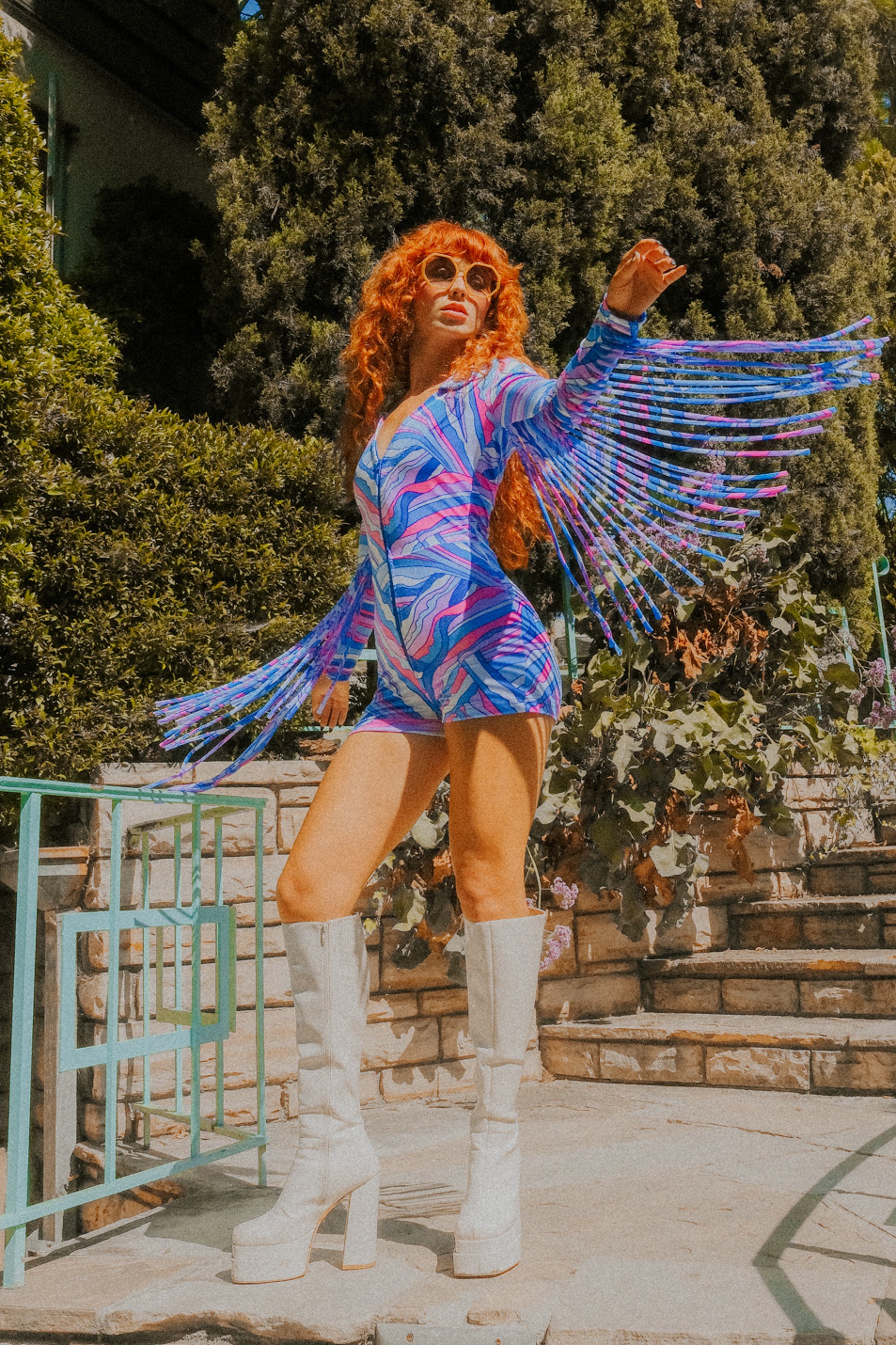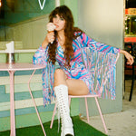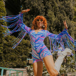 The Psychedelic Swirl Fringe Romper is a disco-meets-cowboy dream come true. Its dreamy details include a zip-up front and fringe along the sleeves. Born to live its best life on the dance floor. Be prepared for nonstop compliments.