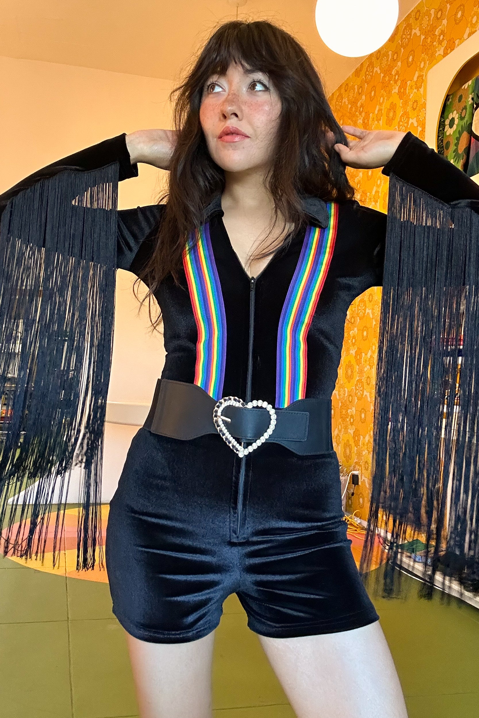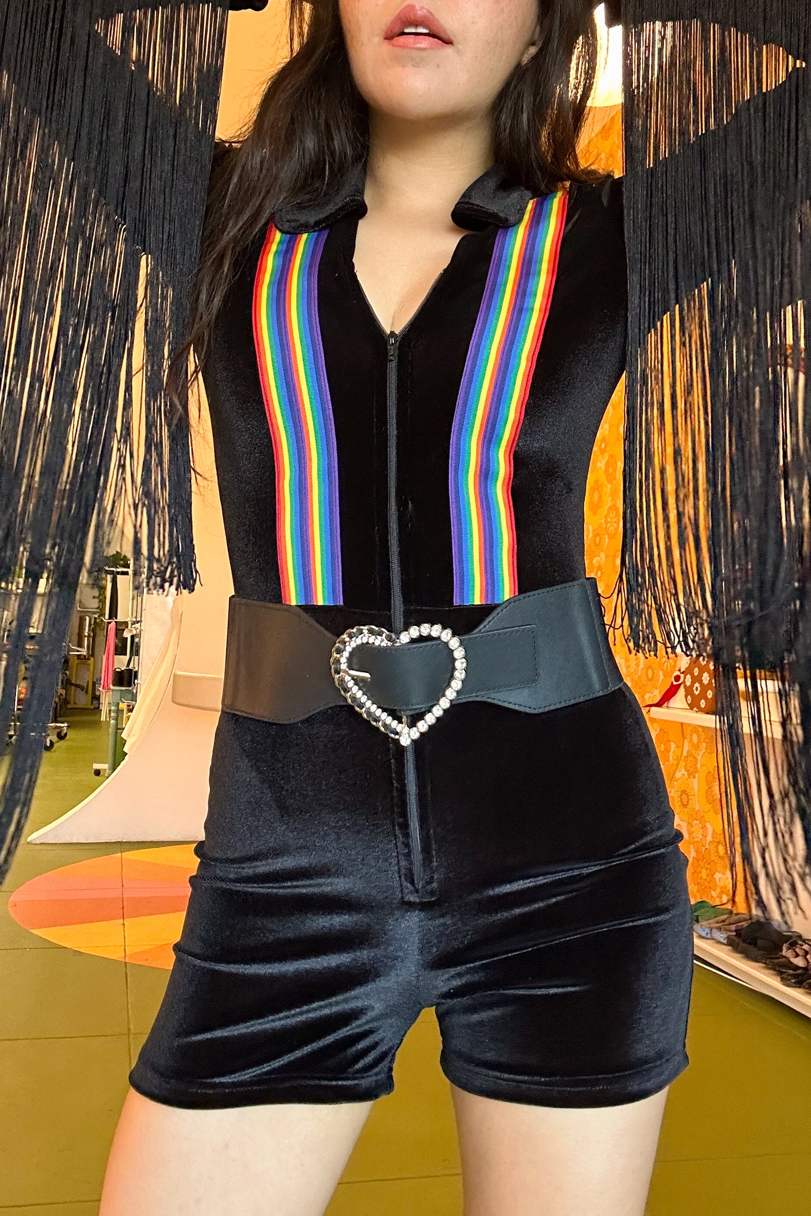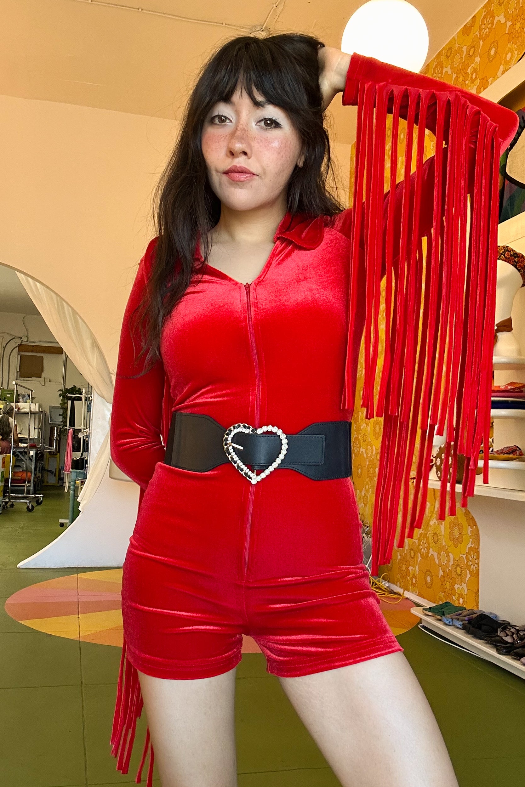 Vintage-inspired heart elastic belt with delicate rhinestone details on buckle, pairs like a dream with our velvet rompers and jumpsuits. Adjustable size.