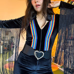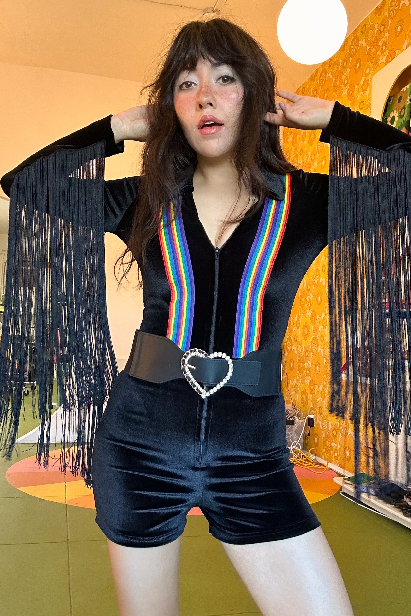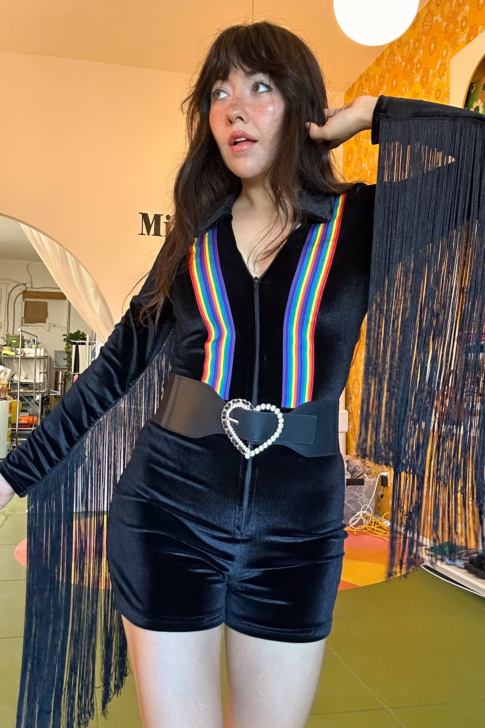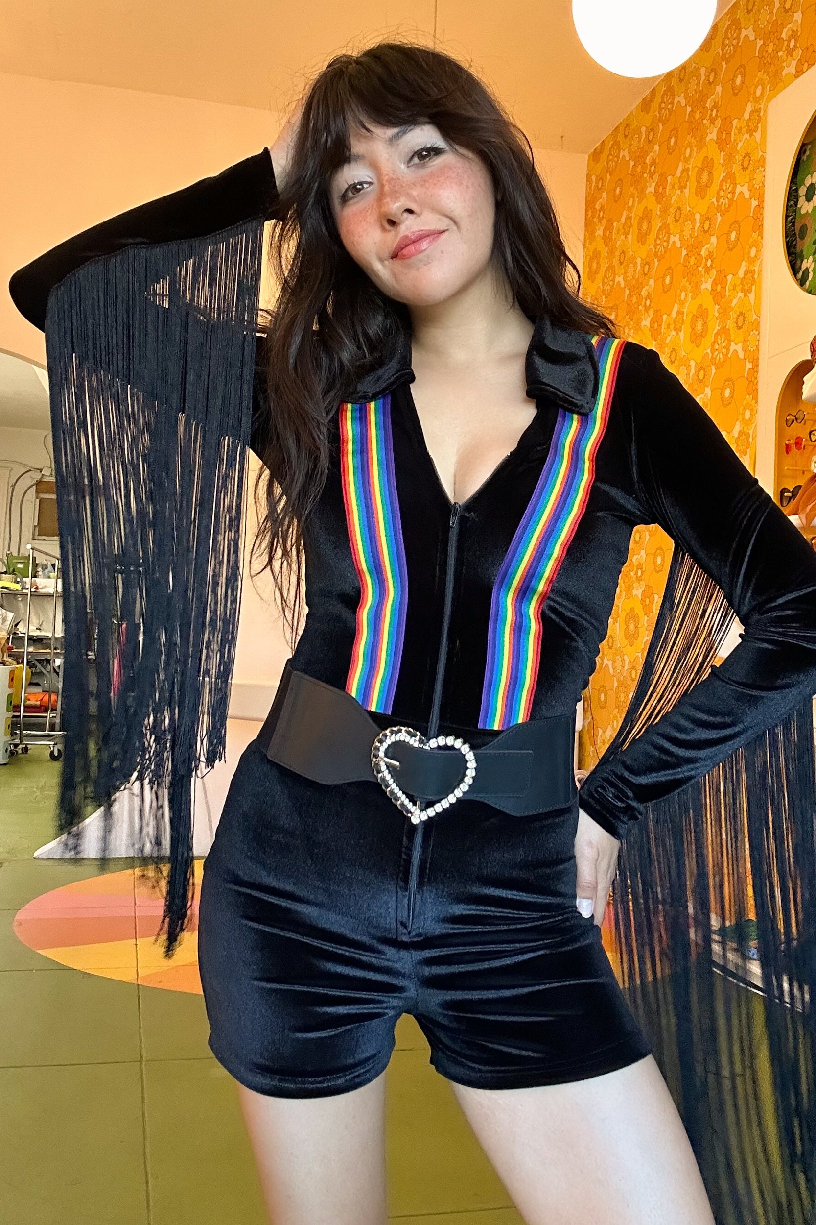 Vintage-inspired heart elastic belt with delicate rhinestone details on buckle, pairs like a dream with our velvet rompers and jumpsuits. Adjustable size.